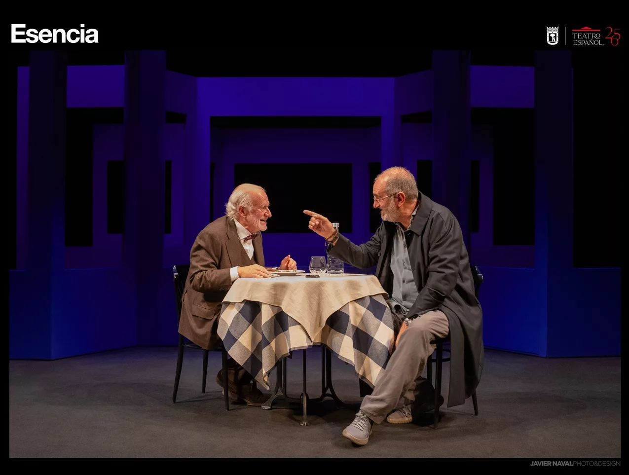 Carambola. Juntar un debate de altura intelectual, con reflexiones subversivas de verdad sobre la sociedad y sus estamentos, con un argumento intrigante que atraiga al público convencional, es casi imposible. Ignacio García May lo consigue sobrepasando todo lo que vemos últimamente y tomando el relevo en cabeza de nuestros autores dramáticos en horas bajas. Pierre y Cecil, dos viejos amigos, se reencuentran por casualidad después de muchos años. Hablan de todo un poco a la espera de un misterioso personaje -novelista de culto al que nadie conoce- que nunca va a llegar. ¿O quizá ha estado presente desde el principio? Esa es la intriga, eso es lo que tendrás que averiguar. Pero mientras, escucharás críticas demoledoras al gremio de los novelistas y al de los profesores y al de los historiadores; abordarás una duda existencial sobre lo que creemos real, sobre la autenticidad de la vida social, desde la alta política al vecino de enfrente, sobre las sucesivas falsificaciones de la historia remota y reciente, y sobre todo, sobre qué es la vida, un libro abierto de futuro incierto o un plan trazado de antemano. Esencia es una pieza enigmática, y en eso radica su principal acierto, plantear debates existenciales de enjundia sin doctrina libresca ni recetas ideológicas ni prejuicios morales. Y hacer que la conversación de dos sexagenarios sentados en una mesa de un nebuloso restaurante durante ochenta minutos resulte por momentos apasionante, llena de recovecos sorprendentes, más que amena casi fascinante, algo que cuestione todas tus certezas de forma incisiva, a veces irónica y hasta graciosa. O que las confirme, como le ocurrirá a algunos. Dice el director de la pieza -que es también director del Teatro Español desde hace alguna temporada- para explicar su ‘necesidad imperiosa de llevarla a escena’ que ‘la voz de Ignacio García May…