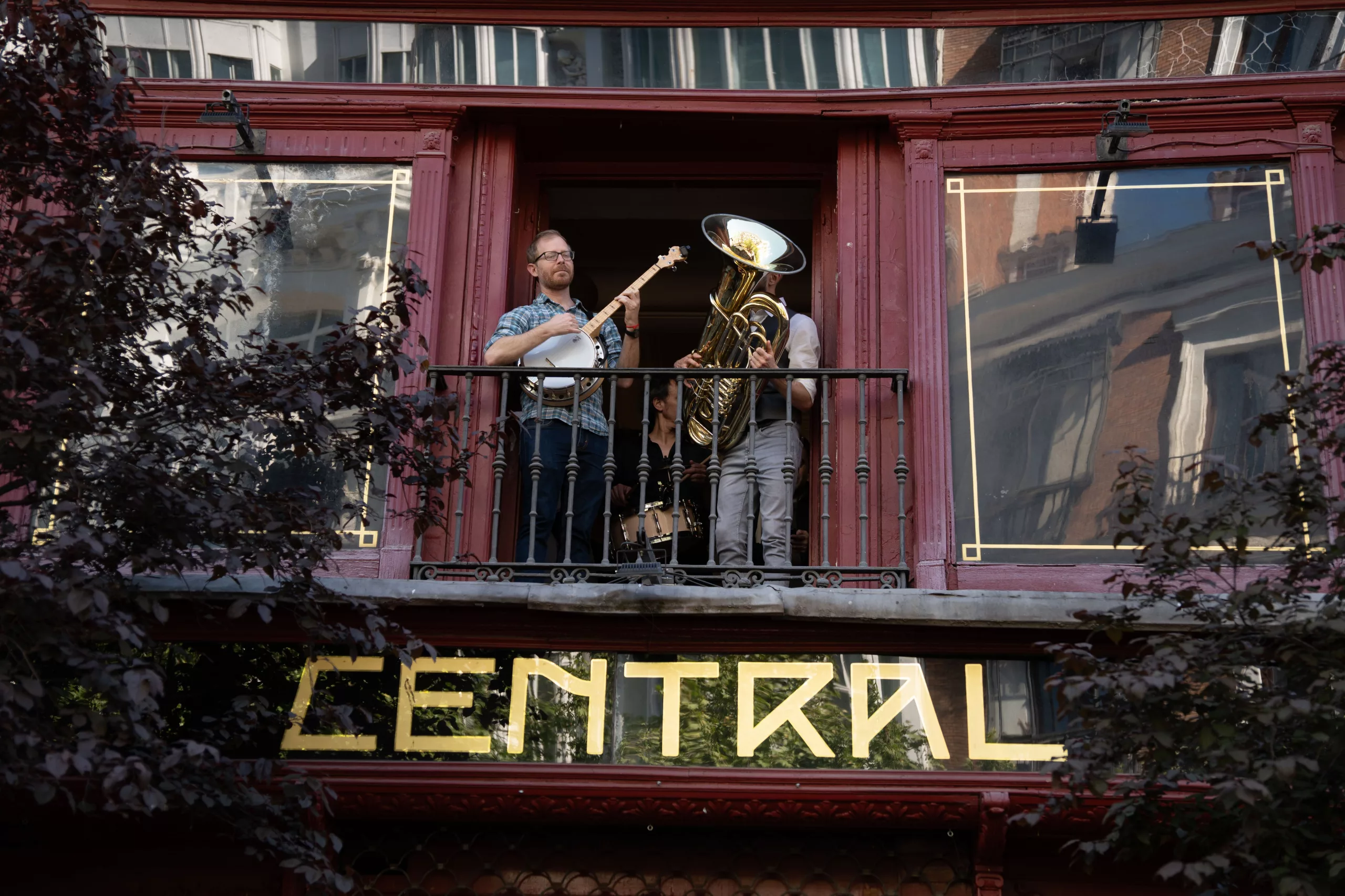 Dos músicos subidos al balcón en la despedida del Café Central, este jueves en Madrid.