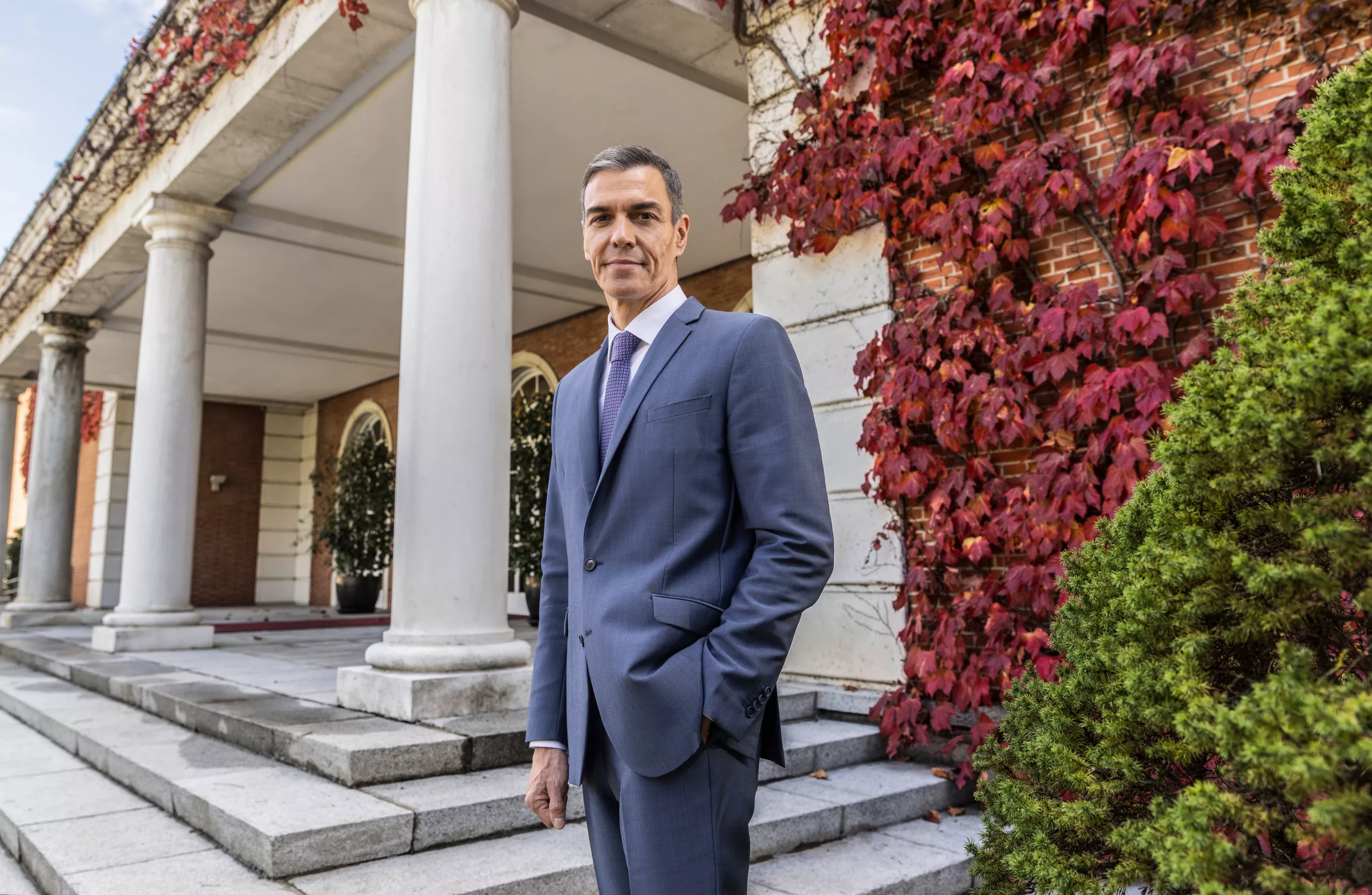 Es jueves por la mañana y el presidente del Gobierno, Pedro Sánchez, de 53 años, llega a la sala Miró de La Moncloa enfundado en un traje azul y de buen talante. Se le ve con ganas de seguir en la lucha. Ni el feroz cerco judicial ni el bloqueo parlamentario de Junts, que se acaba de conocer una hora antes, parecen haberle hecho mella. Por el contrario, en la entrevista afirmará que se vuelve a presentar a las elecciones generales de 2027 e incluso se permitirá un destello sarcástico con el libro de Juan Carlos I: “Todavía no lo he leído, pero también le diré que no va a ser uno de los que recomiende para estas navidades, visto lo visto”.