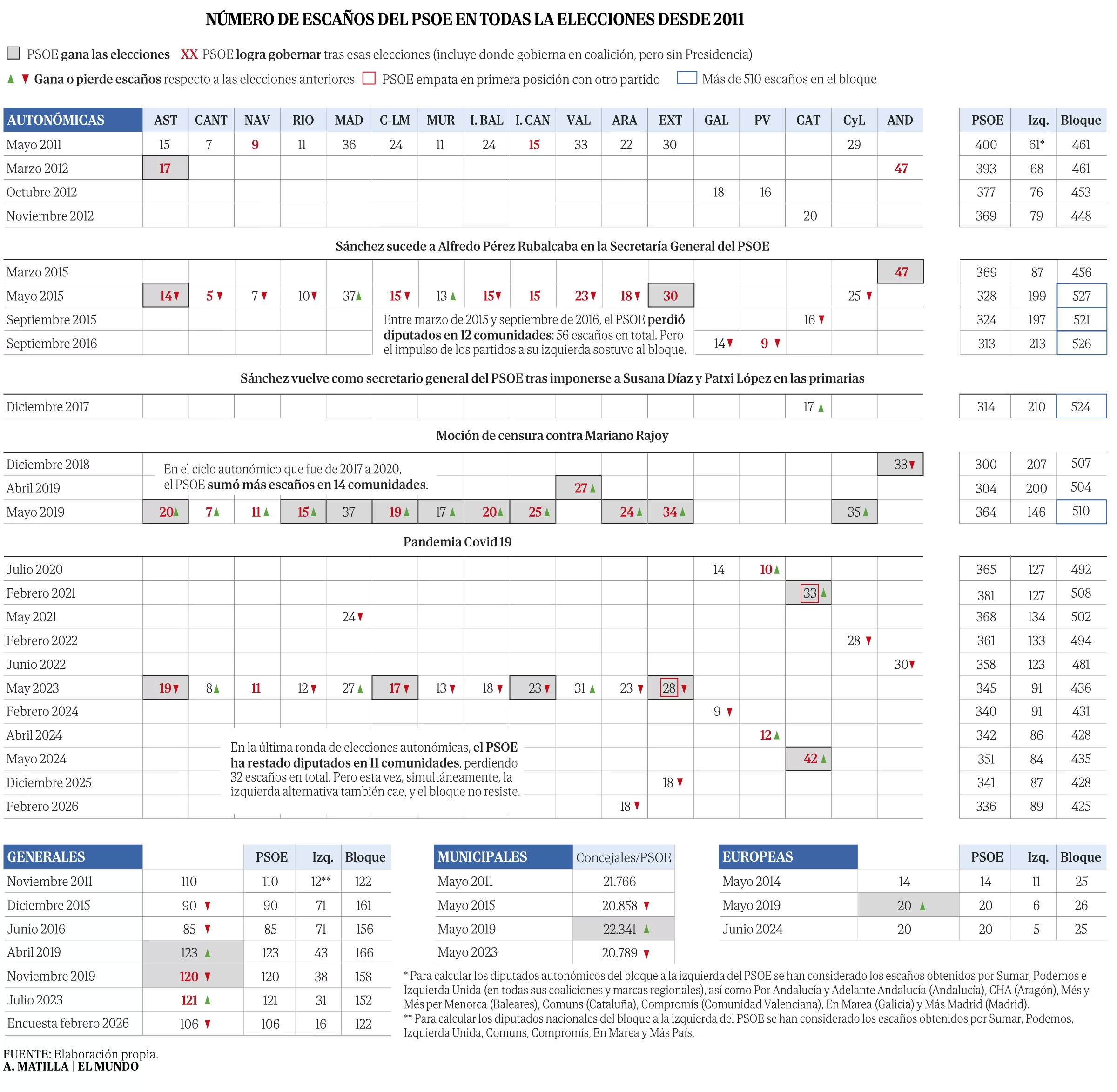 Sánchez lleva a mínimos de poder al PSOE y se multiplica la tensión interna: sólo ha ganado seis de las últimas 26 elecciones